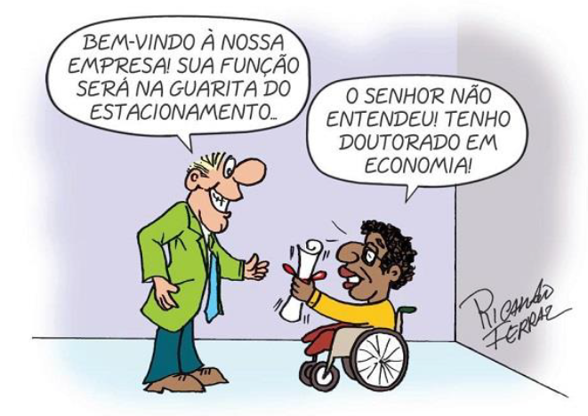 Ao receber uma pessoa com deficiência buscando alguma vaga de emprego, pouca credibilidade e oportunidades são a ela (e possivelmente a todas) concedidas. Neste sentido, a posição do chefe considerou o cadeirante sem, ou pouca formação, e que por isso logo definiu: Sua função na guarita do estacionamento. Na imagem parece haver o imperativo de inferioridade, visto que o chefe, de cima para baixo, destina ao novo funcionário o lugar que irá ocupar, já havendo como conclusão um sujeito que não possui escolarização, logo, com capacidades limitadas. Ao cadeirante, resta sentimentos de subestimação, indignação, tensionamento.