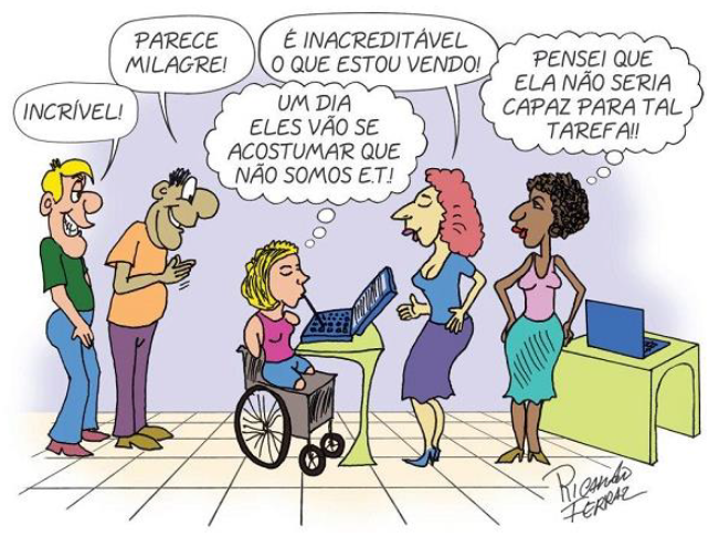 A imagem acima bem representa estas ideias: há uma pessoa cadeirante sem braços e pernas desenvolvendo algum trabalho profissionalmente a despertar olhares curiosos, duvidosos, incrédulos. Ao seu redor, há pessoas que a observam e consideram a tarefa por ela realizada: Incrível. Parece milagre. É inacreditável o que estou vendo. É como se nunca esperassem que alguém com deficiência física pudesse realizar tal tarefa - que na imagem aparece escrevendo com a boca. Há outra pessoa ao seu lado que na imagem ocupa um papel sarcástico: Pensei que ela não seria capaz para tal tarefa. A cena demonstra a ausência de entendimento sobre a deficiência ou, mais do que isso, o entendimento errôneo sobre estas pessoas, limitador, incapacitado.
