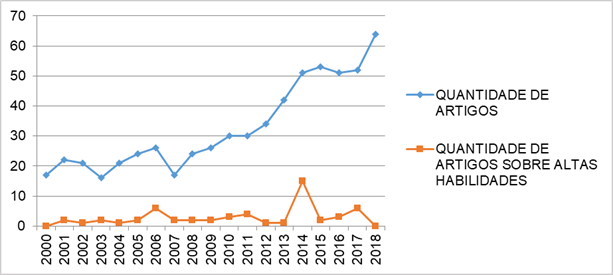 O levantamento realizado na REE resultou em um total de cinquenta e seis (56) produções acadêmicas sobre AH no período de 2000 a 2018. Desse total, foram encontrados cinquenta e cinco (55) artigos3 - dois (02) deles traduções dos artigos publicados em língua inglesa e uma (1) resenha. Esse total de artigos representa 8,84% das publicações da revista em comparação aos artigos publicados sobre outros temas da EE durante o período pesquisado.