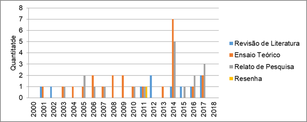 O recorte temporal compreende dezenove anos (n=19) de publicações da REE. Esse recorte de tempo, entre 2000 e 2018, foi selecionado, considerando todo armazenamento das edições disponíveis no site da Revista, no período do levantamento bibliográfico, ocorrido em dezembro de 2018.