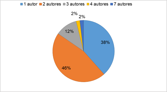 Em relação à autoria dos artigos, percebeu-se que 62% das produções do periódico foram redigidas em coautoria (Gráfico 3). Nesse sentido, confirmou-se uma tendência das publicações no campo da Educação, o que tem sido avaliado como positivo, pois favorece a realização de intercâmbios com outros grupos de pesquisa e auxilia também no desenvolvimento de redes de colaboração científicas interdisciplinares (LOPES; COSTA, 2012).