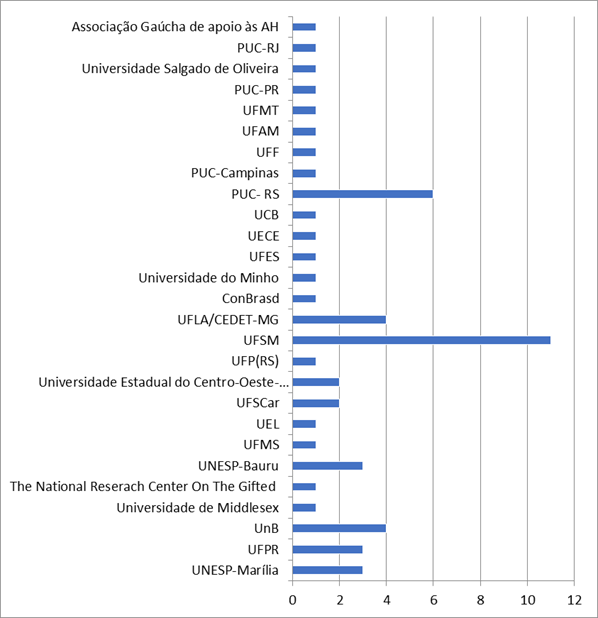 Além dessas instituições, houve contribuições de pesquisadores de Organizações Não-Governamentais, como o Conselho Brasileiro para Superdotação (ConBrasd), a Associação Gaúcha de Apoio às Altas Habilidades/Superdotação (AGAAHSD) e o Centro para o Desenvolvimento do Potencial e Talento (CEDET), entre outras (Gráfico 4).