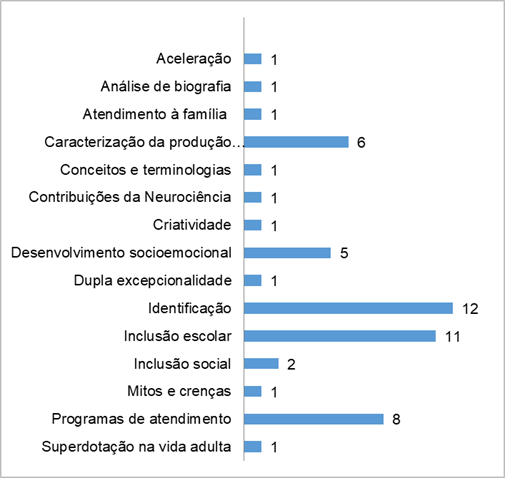No tocante à escassez de produções, ainda foi possível verificar que, entre outros temas, o da dupla excepcionalidade, ao longo dos 19 anos, foi objeto de estudo em apenas uma (n=1) publicação na revista, confirmando a análise realizada por Ourofino (2007). Segundo essa autora, a dupla excepcionalidade, no contexto brasileiro, constitui um tema emergente que vem surpreendendo, inclusive, pesquisadores experientes. Além de ser um tema emergente, convém assinalar que ele ainda resulta em confusão e crítica, especialmente fora da área da educação de estudantes com AH, pois, de acordo com Reis, Baum e Burke (2014), ainda há profissionais que consideram os termos deficiência e AH incompatíveis e esse aspecto pode corroborar para o baixo número de estudos em torno dessa temática.
