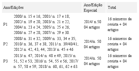 O estudo foi dividido em etapas. A primeira etapa consistiu na divisão da quantidade de números da revista e no período das publicações entre as pesquisadoras, denominadas P1, P2, P3 (Quadro 1).