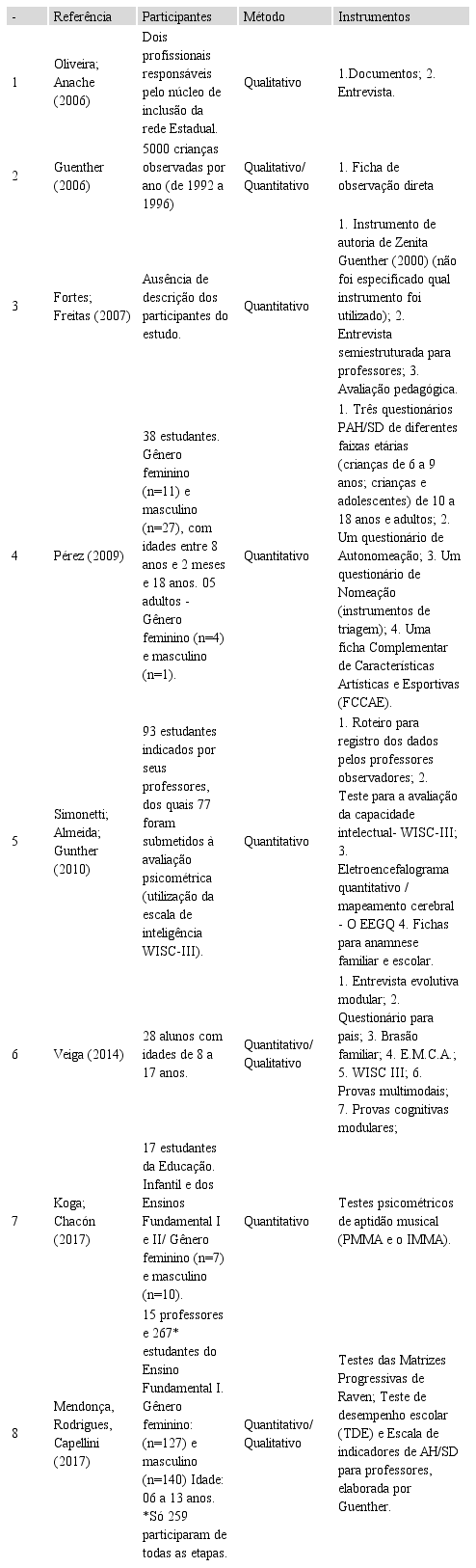 No que se refere aos métodos de pesquisa utilizados nas investigações, representados no quadro 2, observa-se que houve predominância do método quantitativo (n=4), seguido de estudos que utilizaram método misto (n=3) e depois o método qualitativo (n=1). Nota-se, dessa maneira, que vários métodos têm sido utilizados na investigação para a identificação das AH. Se, por um lado, isso pode indicar dificuldades na comparação dos resultados entre os estudos, processo que é reforçado pela variedade e quantidade de instrumentos utilizados em cada investigação; por outro, esse dado pode indicar também que a pesquisa sobre a identificação das AH tem caminhado para a adoção da tese da unidade dos paradigmas - quantitativo e qualitativo - (SANTOS FILHO, 2013), objetivando a compreensão desse tema complexo na área das AH. De acordo com Santos Filho (2013, p. 49), “os métodos quantitativo e qualitativo não são incompatíveis; pelo contrário, estão intimamente imbricados e, portanto, podem ser usados pelos pesquisadores sem caírem em contradição epistemológica”.