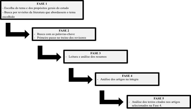 Esta revisão sistemática da literatura foi realizada em cinco fases, interdependentes entre si. As fases se encontram representadas na Figura 1.