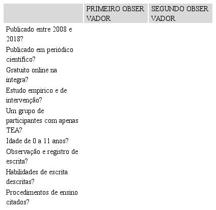 Na Fase 3, realizou-se a análise dos resumos dos artigos encontrados na Fase 2 e da página online do periódico na qual foi publicado. Esta Fase pode ser dividida em duas subfases. Primeiramente, o Quadro 1 foi construído e foram delineados os seguintes critérios de análise: (a) ano de publicação entre 2008 e 2018; (b) publicado em periódico científico revisado por pares (análise da página do periódico online); (c) artigo disponibilizado de forma gratuita e na íntegra online; (d) pelo menos um grupo de participantes do estudo ter diagnóstico de TEA e apenas de TEA; (e) idade das crianças (COLL; MARCHESI; PALACIOS, 2004) entre 0 a 11 anos de idade; (f) o estudo precisava ser empírico e de intervenção3, ou seja, os estudos tinham de incluir a manipulação de variável independente explícita com o intuito de gerar mudanças na variável dependente (estudos que apenas avaliaram comportamentos, sem intervir nos mesmos foram excluídos); (g) precisava haver observação e registro de comportamentos de escrita das crianças (variável dependente tinha de ser a escrita e não outro comportamento); (h) procedimentos de ensino foram citados no resumo. Para os artigos em que todas as respostas fossem sim, seriam registradas, adicionalmente, as habilidades de escrita citadas no resumo e os procedimentos de ensino. Artigos eram excluídos quando qualquer um dos itens tinha como resposta não. Artigos que se repetiam também foram excluídos, restando apenas uma instância dos mesmos na lista de análise.