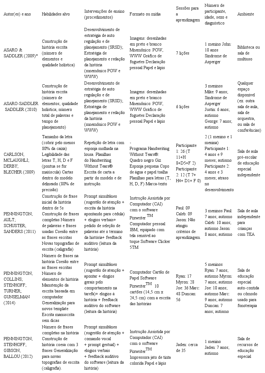 Pennington e Delano (2012), realizaram uma revisão da literatura com o objetivo de resumir e sistematizar as pesquisas empíricas acerca do ensino de escrita para alunos com TEA. Eles revisaram estudos entre 1994 e 2011, analisando quatro questões-alvo: quais habilidades têm sido alvo de intervenção, quais procedimentos têm sido utilizados e se estes são condizentes com as práticas baseadas em evidência2 para o ensino desta população, se as intervenções têm sido efetivas, e a qualidade das pesquisas de acordo com critérios como delineamento experimental, fidelidade de implementação, validade social e generalização das habilidades. De forma geral, os autores relatam que, apesar de todos os estudos terem descrito a aquisição ou o aumento na frequência de respostas corretas de escrita, apenas seis demonstraram relação funcional entre a intervenção e a variável dependente (habilidade de escrita). De acordo com os autores, nenhum dos estudos por eles analisados demonstrou o alcance dos critérios mínimos de aceitabilidade e significância para a magnitude dos efeitos da intervenção, tanto delineamentos de sujeito único como os de grupo. De acordo com a análise dos autores, alguns estudos relataram concordância entre observadores e fidelidade de implementação; outros testaram generalização e manutenção e poucos avaliaram validade social ou aceitação dos procedimentos. Estes resultados, quando olhados conjuntamente, levaram os autores a questionar a real efetividade dos procedimentos propostos nos estudos por eles analisados.