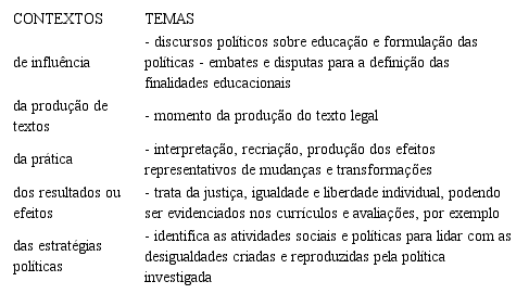 Os resultados são apresentados de acordo com os contextos de influência, da produção de textos, da prática, dos resultados ou efeitos e das estratégias políticas.