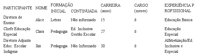 Compreende-se que as gestoras estão em fase inicial de gestão estadual e têm boas intenções. Nota-se, entretanto, que existem limitações para a execução das ações de Educação Especial, nas escolas indígenas, devido a dificuldades de deslocamento até tais comunidades.