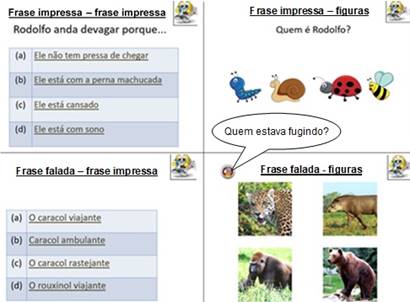 As questões avaliativas eram compostas por uma instrução (falada ou escrita) e quatro alternativas (palavras/sentenças escritas ou figuras), sendo somente uma alternativa a correta, ou seja, o participante poderia deparar-se com uma pergunta apresentada por meio de frase falada (estímulo auditivo) ou escrita (estímulo visual) e as alternativas poderiam ser apresentadas como frases escritas ou figuras (estímulos visuais). O programa apresenta quatro configurações de pergunta e resposta: (1) frase escrita e frase escrita, (2) frase escrita e figura, (3) frase falada e frase escrita e (4) frase falada e figura, representadas na Figura 1. Para as respostas dos participantes havia consequências diferenciais programadas, diante de respostas corretas eram apresentados simultaneamente no computador um elogio escrito (“muito bem!”) e uma figura de um smile sorrindo; em caso de respostas incorretas, eram apresentados por meio do computador a instrução “tente outra resposta” simultaneamente a uma figura de um smile triste, retornando a página da pergunta e das alternativas, até acertar e prosseguir para próxima página do livro (não havia limite de tentativas). Cada livro apresentava, em média, 15 perguntas de múltipla escolha e uma pergunta dissertativa ao final de cada história, solicitando que o participante escrevesse, em uma folha de papel disponibilizada, algo relacionado a história. Por exemplo, no livro “A foca famosa” aparecia uma figura solicitando que o participante escrevesse algo na folha relacionado ao que estava na figura. O objetivo dessa última questão era avaliar a escrita do participante.