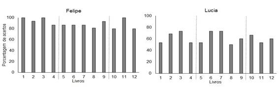 A Figura 2 apresenta a porcentagem de acertos (total) na compreensão da leitura de cada livro. Felipe apresentou 100% de acertos nos livros 1, 3 e 11, ou seja, acertou todas as perguntas dos três livros lidos; nos demais livros, o participante apresentou desempenhos entre 93,7% (livro 2) e 80% de acertos (livros 10 e 12). A participante Lucia apresentou desempenho de 73,3% de acertos nos livros 3, 6 e 7; 68,7% no livro 2; 66,6% no livro 10; 60% nos livros 9 e 12; 53,3% nos livros 1, 4, 5, e 11 e 50% de acertos no livro 8.