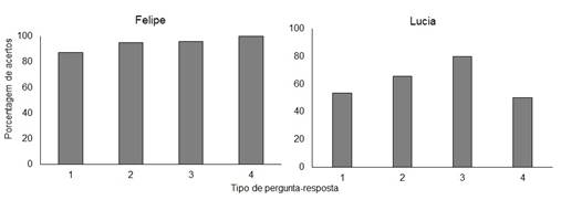 Elaborado pelos autores (2020).A Figura 3 apresenta a porcentagem média de acertos dos participantes por tipo de pergunta-resposta. Observa-se que, nas tarefas do tipo 1, em que a pergunta era apresentada por meio de uma frase escrita e as alternativas também, Felipe apresentou 87,4% de acertos e Lucia 53,7% de acertos; diante de perguntas apresentadas por meio de frase escrita e alternativas em figuras (2), os participantes Felipe e Lucia apresentaram 95,1% e 65,8% de acertos, respectivamente. Na tarefa composta por uma pergunta apresentada por meio de uma frase falada e com respostas em frases escritas (3), Felipe apresentou 95,8% de acertos e Lucia 80% de acertos; e na tarefa em que a pergunta era apresentada por meio de uma frase falada e as alternativas por meio de figuras (4), os desempenhos de Felipe e Lucia foram de 100% e 50% de acertos, respectivamente.