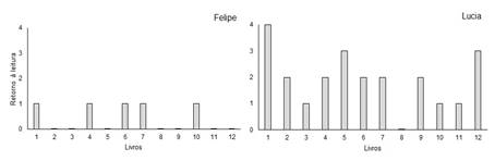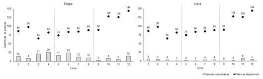 Elaborado pelos autores (2018).A Figura 4 apresenta o número de consulta de palavras no texto pelos participantes. Verifica-se que Felipe consultou 163 palavras ao todo, sendo especificamente 14 consultas no livro 1, 8 no livro 2, 21 no livro 3, 26 no livro 4, 17 no livro 5, 24 no livro 6, 12 no livro 7, 10 no livro 8, 3 no livro 9, 8 no livro 10, 5 no livro 11 e 15 no livro 12. A participante Lucia realizou 42 consultas ao todo. Lucia consultou 5 palavras nos dois primeiros livros, 4 no terceiro livro, 1 no quarto livro, 2 no quinto livro, 1 no sexto livro, 4 no sétimo e oitavo livro, 2 no décimo livro, 8 no décimo primeiro livro e 5 no décimo segundo livro. Ao analisar o número de palavras consultadas mais de uma vez, verificou-se que Felipe necessitou consultar mais de 1 vez uma palavra (comprida) no segundo livro, no terceiro livro (enfeitada), no quarto livro (estava), no sétimo livro (espevitada), no oitavo livro (floresta), no décimo livro (claras), no décimo segundo livro (resolveram) e 4 palavras (cria, aprende, grita, alegre) no sexto livro. Lucia precisou repetir a consulta de apenas 1 palavra (orelhudo) no livro 11; as demais palavras foram consultadas 1 vez.