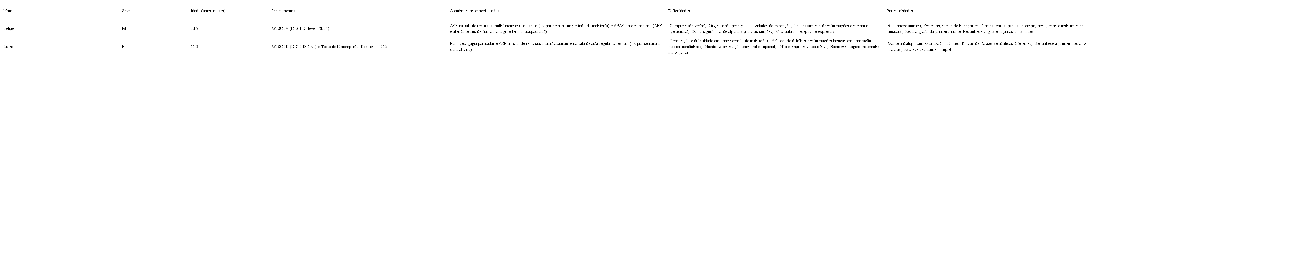 Para caracterizar os participantes, analisou-se o prontuário de cada aluno para obter o diagnóstico clínico da deficiência intelectual (WISC III – WECHSLER, 2002 ou o WISC IV - WECHSLER, 2004), considerando os resultados descritivos do relatório da equipe multidisciplinar da instituição responsável pelo diagnóstico no município, a Associação de Pais e Amigos dos Excepcionais (APAE). A Tabela 1 apresenta as informações coletadas no prontuário escolar dos participantes: nome fictício, sexo, idade, instrumentos de avaliação diagnóstica da deficiência aplicado por uma instituição especializada (indicado a data da aplicação), atendimentos especializados, as dificuldades e potencialidades apresentadas nos instrumentos avaliativos conforme descritos nos prontuários.