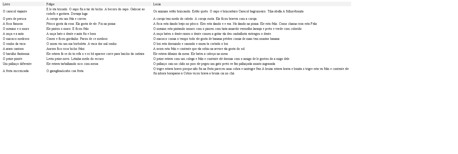Na pergunta dissertativa dos livros, não foi realizada uma análise de acerto ou erro por ser livre em escrever sobre a figura apresentada ou comentar sobre algum aspecto da história lida. Desse modo, verificou-se que, em todas as respostas para os 12 livros lidos, houve uma coerência da frase escrita com o que os participantes haviam lido na história, apresentando erros na escrita correta das palavras. A maneira de formular frases e escrevê-las no papel mostraram-se diferentes entre os dois participantes, Felipe refletia o que gostaria de escrever, interagia com a pesquisadora fazendo perguntas e comentários sobre a história (ainda comentava durante a leitura do livro sobre o que achava que iria acontecer, se havia gostado ou não, narrava as figuras que apareciam), já, no momento da escrita, pausadamente por palavras, buscava falar em voz alta para, então, compor a palavra desejada por meio da junção de sílabas. Lucia não comentava sobre a história e não falava em voz alta o que desejava escrever em suas respostas; ouvia a solicitação do programa para escrever uma frase e logo começava a escrever.