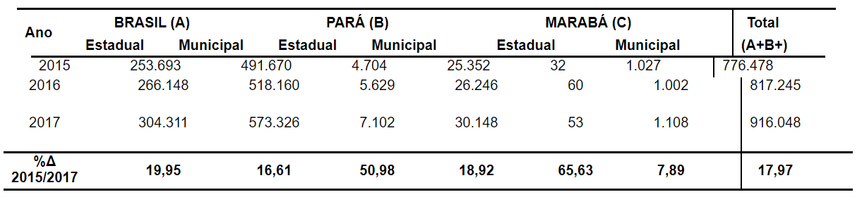 A Rede de Ensino Estadual em Marabá obteve o percentual de 65,63%. Esse número não expressa a realidade de maneira abrangente, pois o acréscimo representa apenas 21 matrículas, enquanto que, na Rede de Ensino Municipal, o percentual foi de 7,89%, com o aumento de 81 matrículas de alunos com deficiência. Além disso, enfatizamos que a variação de crescimento de matrícula foi constante a cada ano, porém a Rede Estadual, em Marabá, apresentou dados oscilantes com perda em relação aos dados de matrículas do ano anterior no comparativo, entre os anos de 2016 e 2017.