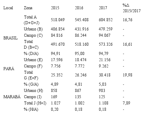 Ao analisarmos os dados da Tabela 2, percebemos que, no Brasil, no Pará e em Marabá, as matrículas dos alunos com deficiência, de maneira geral, nas redes de ensino municipais, na zona urbana e no campo, tiveram aumento nos índices em cada ano, ou seja, o crescimento manteve-se constante, mesmo com pouca elevação de percentual. Há, contudo, uma exceção: os valores que representam o indicador referente ao campo no município de Marabá demonstraram que houve um decréscimo de aproximadamente 26,04%, enquanto a zona urbana teve um aumento de 14,57%.