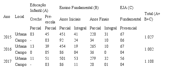Ao mensurar as matrículas agregadas com os valores de parcial e integral, tanto para localização urbana quanto para o campo, estas corresponderam aproximadamente com o percentual de 59,20%, no ano de 2015. Em relação ao ano de 2016, houve um decréscimo com a redução para 56,19%, mas novamente torna a aumentar para 58,75%, em 2017. Ao observarmos o conjunto dos resultados, constatamos um aumento de ordem progressiva para a zona urbana e para o campo com variação percentual de 7,89%, na série histórica.