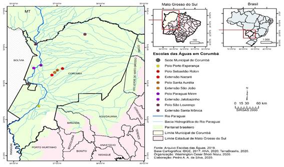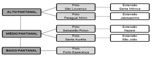 Legenda: 1 – Polo Porto Esperança; 2 – Polo Santa Aurélia; 3 – Extensão São João; 4 – Polo Sebastião Rolon; 5 – Extensão Nazaré; 6 – Polo Paraguai Mirim; 7 – Extensão Jatobazinho; 8 – Polo São Lourenço; 9 – Extensão Santa Mônica.