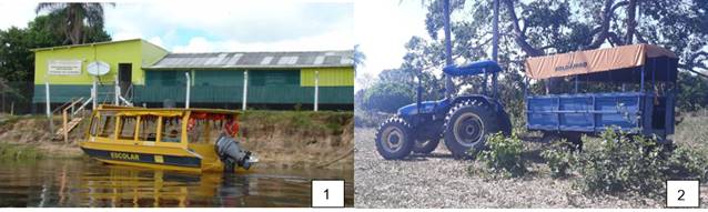 Segundo as informações da Equipe Gestora, em 2019, aos alunos que residiam nas imediações das unidades de ensino – cujo trajeto casa-escola e vice-versa pudesse ser feito no tempo de até uma hora – era disponibilizado o transporte escolar diário. Em face da geografia física do Pantanal, o transporte dos alunos nas Escolas das Águas era realizado pelo “barco escola” e pelo “trator com carretinha”, vistos na Figura 5.