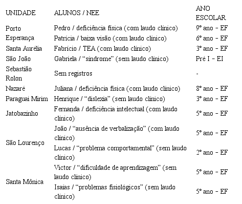 Por meio de interlocuções com os professores e a equipe gestora das Escolas das Águas, levantamos informações – apresentadas no Quadro 1 – sobre os alunos considerados com NEE, englobando os definidos como PAEE, matriculados no ano de 2019.
