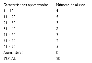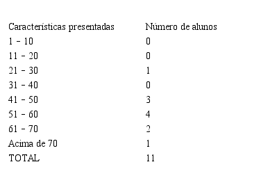 A análise das listas de características preenchidas pelos professores da escola pública revelou a média de 35 características por aluno, de modo que a maioria das crianças apresentava de 31 a 40 características, como mostra a Tabela 1.