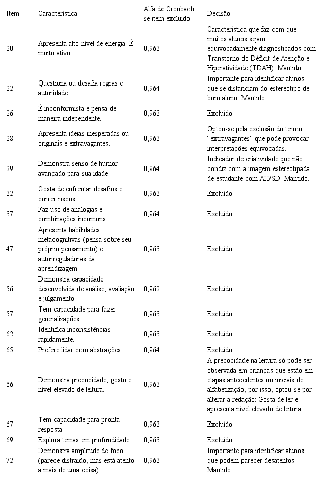 Ao analisarmos os resultados da EIPIAHS junto aos 71 alunos avaliados, 26 itens apresentaram baixa pontuação, obtida a partir da somatória referente a todos os alunos. Na sequência, confrontamos tais itens com as características que apenas foram assinaladas como passíveis de serem observadas por até um terço dos professores em ao menos um dos grupos. A partir desse cotejo, identificamos 16 itens com baixa pontuação obtida durante a aplicação na escola, os quais também foram pouco sinalizados como passíveis de observação no momento em que os professores avaliaram o instrumento. Tais itens foram submetidos a análise de um grupo de pesquisadores em educação inclusiva que estuda a temática das AH/SD, a fim de decidir, coletivamente, sobre a manutenção, exclusão ou modificação de cada um deles. Verificamos também o coeficiente de Alfa de Cronbach se o item for excluído. O Quadro 1 apresenta essas características e a decisão tomada a respeito de cada uma delas.