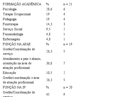 Dos questionários recebidos nem todas as questões foram respondidas por todos os participantes. Em cada um dos dados analisados estão a quantidade de respostas referentes aos itens. A totalidade dos respondentes desse estudo é constituída por mulheres, com média de idade de 42,5 anos (DP = 11,2), com formação predominante em Psicologia (28,6%). Nenhuma das participantes relatou ter realizado algum curso de pós-graduação em IP/EP. Com relação ao tempo de trabalho na APAE, o tempo médio de meses trabalhados foi de 163 meses, sendo que 36,8% têm como função atividades relacionadas à sua área de atuação dedicando-se, principalmente, a orientação e atendimento de crianças e seus pais. Com relação ao tempo de atuação com IP/EP, a mediana de tempo de trabalho foi de 60 meses e, a principal função também foi de atividades relacionadas à sua área de atuação (50%, n = 10), seguida por coordenação de serviços de saúde/gestão (45%, n = 9). Esses dados podem ser observados na Tabela 1.