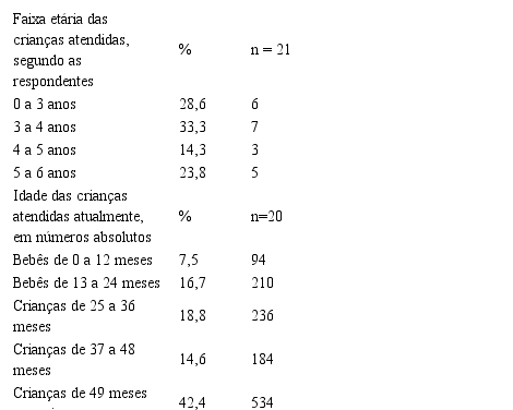 A Tabela 2 apresenta dados relacionados a faixa etária atendida e o número de crianças atendidas em cada uma delas. Com relação à faixa etária das crianças, 33,3% (n = 7) afirmaram atender crianças entre zero e quatro anos de idade. Todavia, relataram maior frequência de atendimento na faixa etária acima de quatro anos de idade (43,4%).