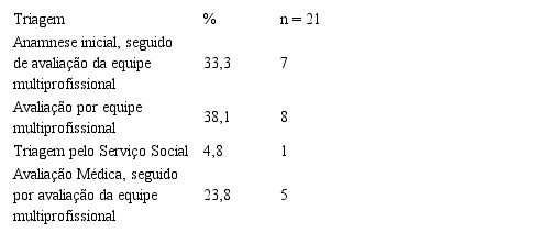 Com relação à triagem, 38,1% (n = 8) referiu ser realizada por uma equipe multiprofissional constituída, geralmente, por psicólogo, assistente social, fisioterapeuta, terapeuta ocupacional, fonoaudiólogo e pedagogo. Os dados referentes ao processo de triagem encontram-se na Tabela 3.