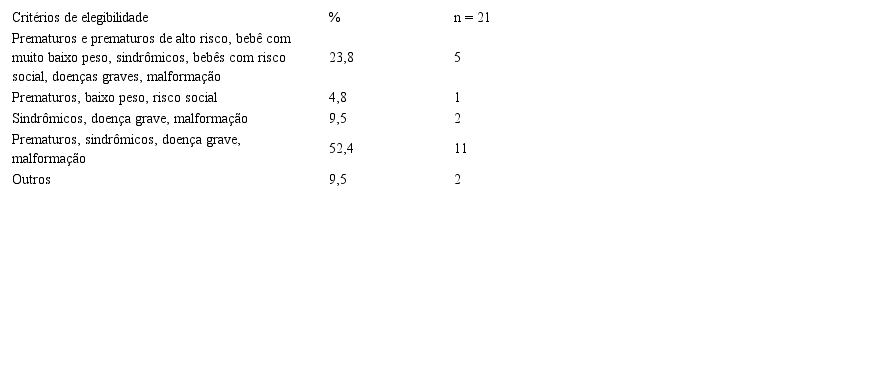 Os resultados referentes às condições do bebê que são critérios de elegibilidade para participar do programa de IP/EP encontram-se na Tabela 4. Os mais frequentes foram prematuros, sindrômicos, doença grave, malformação (52,4%) e, para 23,8% foram incluídos os bebês prematuros de alto risco, bebê com baixo peso ao nascer e com risco social.