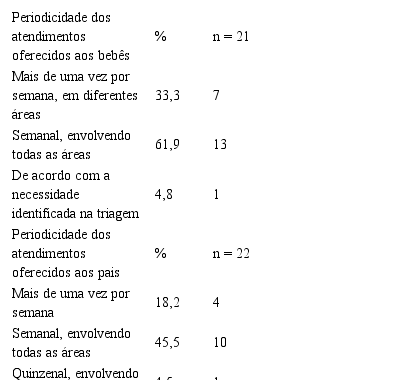 No que se refere aos programas de IP/EP ofertados, a participação prioritária nos programas é voltada para crianças e cuidadores (pais e/ou responsável) em 86,4% (n = 19). Ao serem indagados sobre como acontece a participação dos pais e/ou responsáveis, 68,2% (n = 15) responderam que acontece desde a triagem e, 31,8% (n = 7) que acontece nos serviços disponibilizados e continua em casa. Quanto à periodicidade dos atendimentos oferecidos aos bebês, 61,9% (n = 13) das respostas válidas referiram que esse era semanal e envolvia todas as áreas. Já com relação à periodicidade dos atendimentos oferecidos aos pais, 45,5% (n = 10) responderam que também era semanal e envolvia todas as áreas (pediatria, psicologia, fisioterapia, fonoaudiologia, terapia ocupacional, pedagogia). Os resultados referentes à periodicidade dos atendimentos oferecidos aos bebês e aos pais estão apresentados na Tabela 5.
