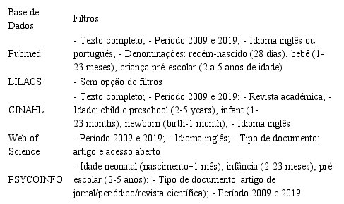 Para a seleção dos estudos, foram aplicados os critérios de inclusão: resumos e artigos disponíveis; idioma de publicação português e inglês, entre 2009 e 2019; e crianças menores de seis anos de idade. Excluíram-se os estudos que não apresentava resumo disponível e acesso online livre na íntegra; não ter em seus resultados contribuições para as perguntas estabelecidas na revisão; não possuir o caminho metodológico claramente descrito, revisões de literatura, dissertações, teses, livros e capítulos de livros.