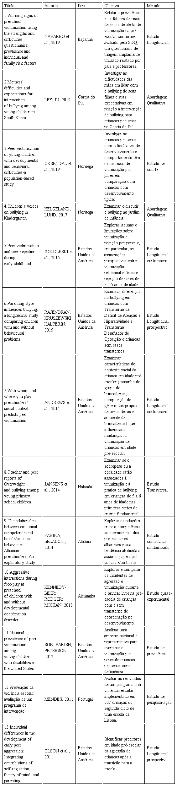 A delimitação do período de busca justifica-se por seu objeto de investigação, que sofre transformações continuamente, e por considerar a relevância de incluir os estudos originais publicados mais recentemente e ainda pouco explorados. Assim, foram incluídos nesta revisão estudos originais, publicados na íntegra em periódicos científicos, revisados por pares, com crianças menores de seis anos de idade, abordagem sobre bullying na primeira infância e que apresentaram a repercussão do bullying ao desenvolvimento da criança. Abordagens quantitativas e qualitativas foram consideradas com o objetivo de abranger a diversidade da repercussão que o bullying traz nesta faixa etária.