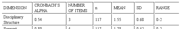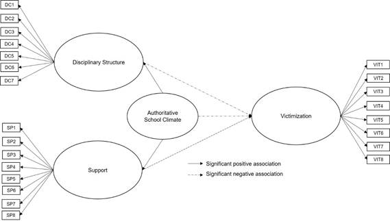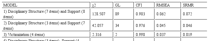 The disciplinary structure was composed of items DC3, DC6 E DC7. Support was composed of items SP1, SP2, SP4 e SP8, and victimization by VIT2, VIT3, VIT4, VIT6. The other items were removed because they did not meet the statistical criteria of the study.
