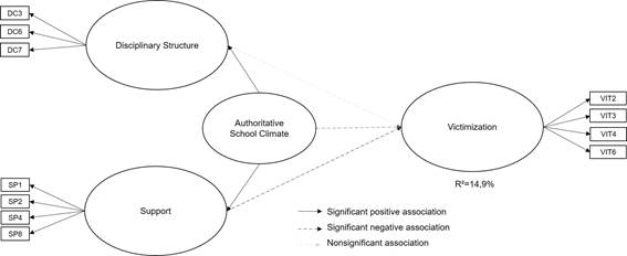 First, it was hypothesized that the authoritative school climate would be organized in a two level hierarchy, with the latent factors of disciplinary structure and support being predicted by an authoritative school climate (BERG; CORNELL, 2016; THAPA et al., 2013), while peer victimization would be aggregated in a single latent factor. Secondly, it was hypothesized that the school’s disciplinary structure and support would be negatively associated with peer victimization (BERG; CORNELL, 2016; CORNELL; SHUKLA; KONOLD, 2015; KONOLD; CORNELL, 2015), above and beyond the influence of age or gender of participants.
