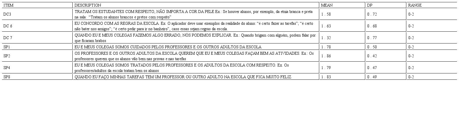 Following these initial stages, a pilot study was conducted to evaluate the instrument modification with nine students with ID (mild diagnostic 44.5%, moderate 33.3%, severe 11.1% and non-specified 11.1%), including 77.8% male, between 20 and 40 years old (Mage = 27.8, SD = 6.3). The data collection occurred individually in the school, and time to complete the questionnaire ranged between 15-30 minutes, and eight of the students requested that the researchers read the forms for them. The items that were not easily understood by participants were reviewed, with the inclusion of an alternative explanation to be used whenever the item was not accessible to the student (e.g., Item: DC3: “Quando eu e meus colegas fazemos algo errado, nós podemos explicar” - “When my colleagues and I do something wrong, we can explain”, if the participant does not understand, researcher says “Quando brigam com alguém, podem falar por que ficaram brabos” - When they fight with someone, they can talk about why they got angry ”). The participants of the pilot study were again consulted by the researchers and presented fewer doubts during the application of the scales, resulting in the modified versions of the instruments described below.