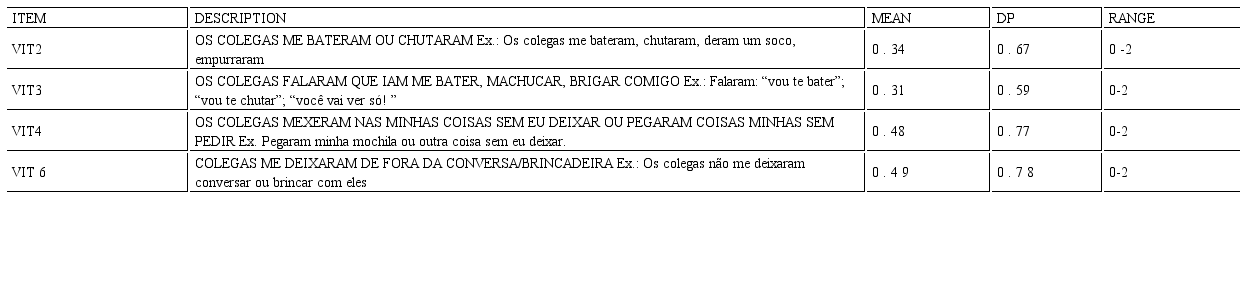 Peer victimization was evaluated through a modified version of the Aggression and Victimization Scale (CUNHA; WEBER; STEINER, 2011), following the same procedures described earlier. This is also a self-report instrument that investigates peer victimization through direct aggression, relational aggression and victimization (composed by eight items, e.g., “Colleagues hurt me”). In this study, only victimization was tested and the items are represented at table 2.