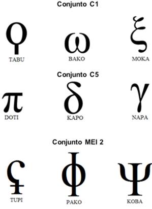 Foram utilizados três conjuntos de estímulos, cada um contendo três cartões com imagens de letras do alfabeto grego sob um fundo branco, medindo 5 cm x 5 cm. Cada estímulo recebeu um pseudo-nome construído a partir de uma avaliação do repertório ecoico dos participantes (ver Procedimento). Os pseudo-nomes dos estímulos utilizados no estudo foram palavras dissílabas sem dificuldades na língua portuguesa, como encontros consonantais, vocálicos ou dígrafos. Optou-se por utilizar letras do alfabeto grego e pseudo-nomes para garantir um maior controle experimental, de modo que fosse improvável que os participantes tivessem acesso a esses estímulos fora do ambiente experimental. Os conjuntos C1 e C5 foram utilizados nos procedimentos de SPOP e MEI1 e o conjunto MEI2 no procedimento MEI2 (ver Figura 1).
