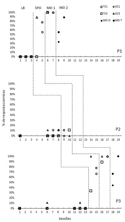 Após a implementação do SPOP, o participante P1 respondeu corretamente em 56% das tentativas de tato e 78% de ouvinte para o conjunto de estímulos C1. Destaca-se que P1 acertou todas as tentativas de tato para um dos estímulos (MOKA). No entanto, o participante P1 repetiu o nome desse estímulo na presença dos outros estímulos, indicando que a resposta não estava controlada adequadamente pela figura da letra grega relacionada ao pseudo-nome MOKA. Em relação aos estímulos do conjunto C5, após o SPOP, o participante P1 não apresentou nenhuma resposta correta de tato, mas apresentou um desempenho de 89% de acertos para o repertório de ouvinte. Após o treino de MEI 1, o participante P1 apresentou 100% de acerto nos testes de tato e ouvinte, tanto para os estímulos do conjunto C1 quanto para os de C5. Após o procedimento de MEI 2 (com novos estímulos), P1 apresentou 33% de acertos no teste de ouvinte e 56% no teste de tato na primeira sessão de teste, e 89% de acertos para ambos os repertórios, na segunda sessão de teste.