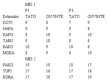 Nas tentativas de treino de ouvinte, três estímulos eram posicionados na frente do participante e era solicitada a seleção de um desses estímulos. As primeiras três tentativas do treino de ouvinte também eram realizadas com ajudas (a primeira com ajuda física total, conduzindo a mão do participante até o cartão correto; a segunda com fading da dica - o experimentador apontava o estímulo correto, e a terceira com atraso de três segundos da dica). Respostas corretas consistiam na seleção (apontar ou pegar o estímulo) dos estímulos nomeados e eram reforçados socialmente. Respostas incorretas ou omissão de respostas eram seguidas de dica física total e imediata. O critério de aprendizagem foi de três tentativas corretas consecutivas (desconsiderando as tentativas com ajuda) para cada repertório. Alcançado o critério de aprendizagem, com o objetivo de confirmar a aprendizagem das respostas diretamente ensinadas no MEI 1 e sua manutenção na ausência de reforçamento, era realizado um teste dos repertórios de tato e de ouvinte com o mesmo conjunto e no mesmo formato dos testes realizados após o SPOP (o mesmo ocorreu após o critério ser atingido no MEI 2).