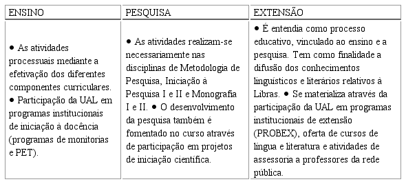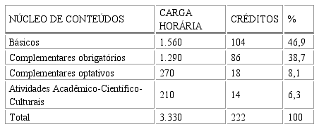 O curso de Letras Libras estruturou-se em alguns núcleos de conteúdo que perfaziam 3.330 (três mil trezentas e trinta) horas de atividades didáticas, as quais correspondiam a 222 (duzentos e vinte e dois) créditos, da seguinte forma: