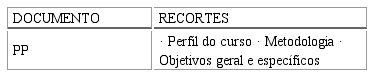 O documento supracitado (PP) que totaliza quarenta e seis páginas, em quatorze tópicos, versando sobre a identificação do curso, o histórico, o perfil do egresso, a organização curricular, os componentes curriculares e a minuta da resolução de criação do curso supracitado; teve como foco de análise, conforme exposto na metodologia desta pesquisa, o perfil do curso, a metodologia e os objetivos.