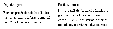 Conforme as informações que o quadro apresenta, é possível identificar, no primeiro objetivo, que há um investimento na difusão de conhecimentos de Libras, tanto no âmbito acadêmico como no social. Contudo, um ponto chamou atenção: a produção de textos sinalizados e escritos. Aqui, nesse encontro da língua oral – na modalidade escrita - e da língua de sinais está o grande ponto de tensão do ensino de e para as pessoas surdas, haja vista que, enquanto a língua portuguesa é apresentada como modalidade bastante usual entre as pessoas surdas, os textos sinalizados são pouco legitimados pelo meio acadêmico e social.