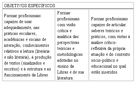 Esse prisma de análise foi estendido aos outros dois objetivos. No segundo objetivo, tem-se que o curso formará profissionais com visão crítica e analítica sobre a teoria e a metodologia no ensino de Libras, sem uma posição sobre quais teorias nortearão a formação desse profissional e dessa profissional. Tal delimitação é crucial para determinar a visão crítica a ser disseminada pelos graduandos e pelas graduandas, indicando uma “frágil sustentação conceitual na formação profissional” (MARÇAL et al., 2014, p. 122).