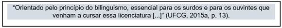 Assim, definimos como questão de pesquisa1: De que forma o curso de Letras Libras aborda os aspectos que envolvem os princípios bilíngues em seu PP (Projeto Pedagógico)? Assim, o objetivo da pesquisa foi identificar aspectos dissonantes com relação aos princípios bilíngues no PP do curso de licenciatura em Letras Libras.