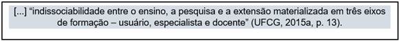 Outro ponto analisado consiste no eixo trino de formação proposto pelo curso, conforme segue: