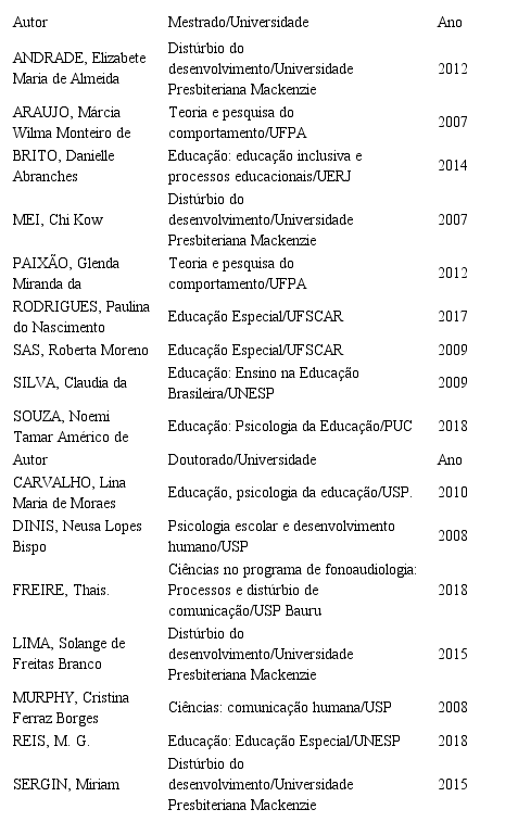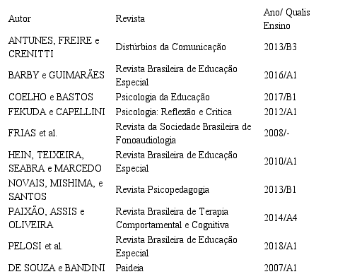 Os estudos que integraram a revisão foram publicados entre os anos de 2007 e 2018. Dividem-se em 10 artigos, 10 monografias e 7 teses. Grande parte dos artigos foi publicada em revistas de Qualis A1 para Ensino (ver Tabela 1), sendo que 5 deles tem como área de conhecimento a Educação e/ou Educação Especial, 3 a Fonoaudiologia e/ou Comunicação e os demais, a Psicologia.