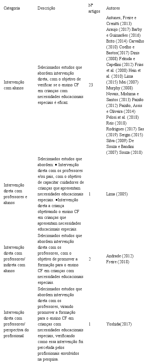 Diante do que foi exposto, é possível observar que em grande parte dos estudos, os pesquisadores realizaram as intervenções diretamente com as crianças. Em uma análise mais detalhada dos estudos categorizados na Tabela 4, é possível verificar que em 1 deles a intervenção foi realizada de forma direta com professores e alunos, em 2 a intervenção foi direta com professores e indireta com alunos e em outro a intervenção foi direta com professores visando treiná-los e posteriormente verificar sua perspectiva quanto ao trabalho, um estudo qualitativo.